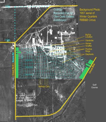 Beneva Road was called "Oriente" and was just two lanes until the 80's, when it was expanded. Below is a 1957 aerial photo of the Circus property with an overlay of current lots in Glen Oaks Estates.