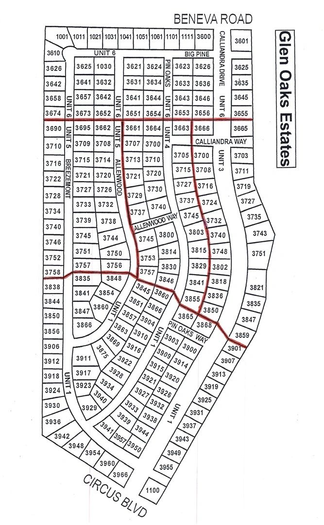 The map shown below depicts the house number addresses of the lots in Glen Oaks Estates. Beneva Road, at the top of the map, is on the west side of the subdivision.
